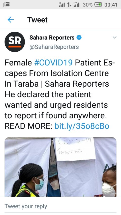 2 May 2020 K. Paul FEMALE COVID-19 PATIENT ESCAPES FROM ISOLATION CENTRE IN TARABA. Share this: Share on X (Opens in new window) X Share on Facebook (Opens in new window) Facebook Share on WhatsApp (Opens in new window) WhatsApp More Share on LinkedIn (Opens in new window) LinkedIn Share on Pinterest (Opens in new window) Pinterest Like Loading... Related