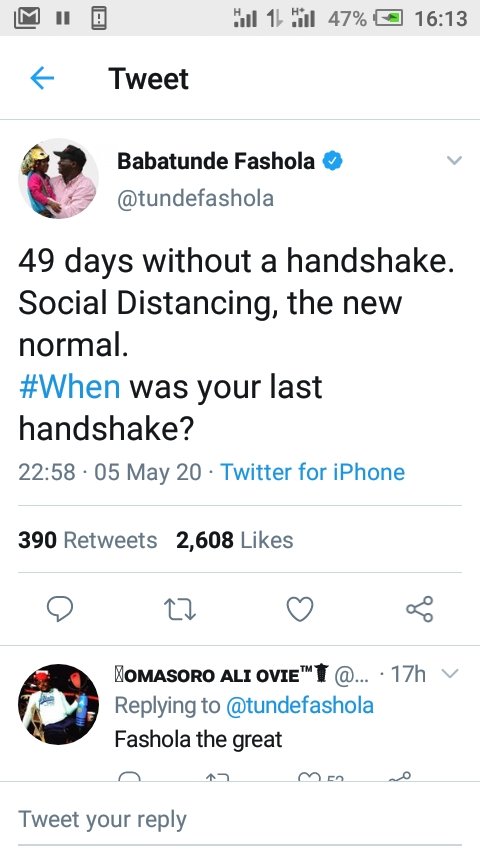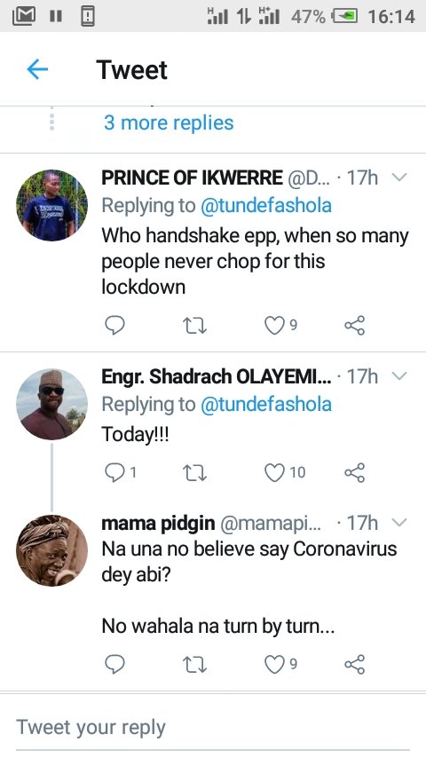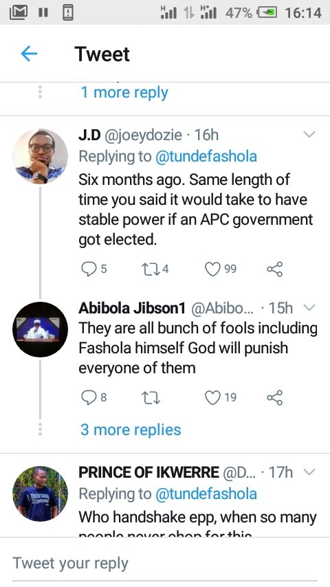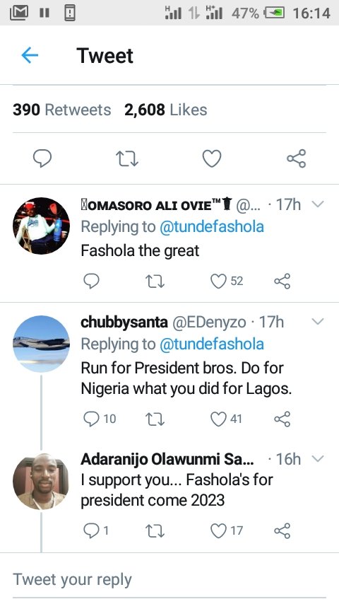 6 May 20206 May 2020 K. Paul Fashola for President ,2023 – fans chanted on Twitter The former Governor of Lagos State shared this on his Twitter, but his fans thrilled him down the presidency path.. Here are some of the screenshots from the reactions: Share this: Share on X (Opens in new window) X Share on Facebook (Opens in new window) Facebook Share on WhatsApp (Opens in new window) WhatsApp More Share on LinkedIn (Opens in new window) LinkedIn Share on Pinterest (Opens in new window) Pinterest Like Loading... Related