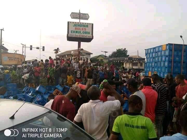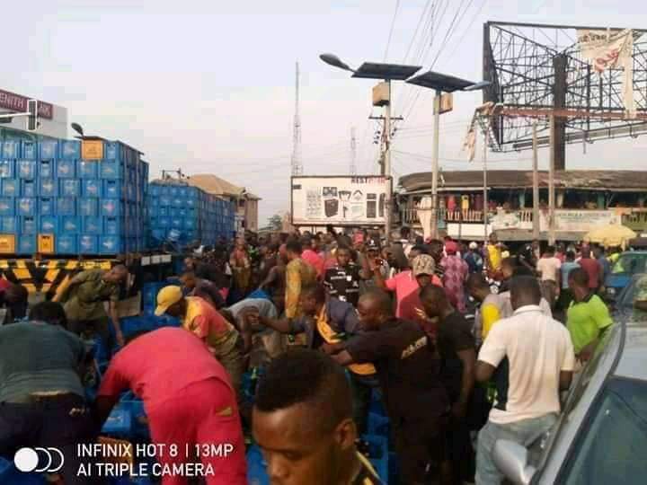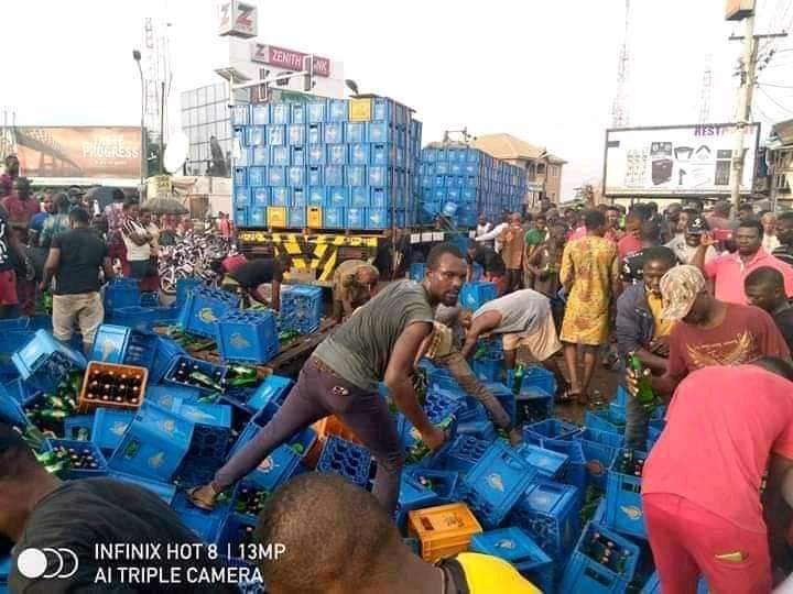 As trailer carrying hero beer fell down in Ekwulobia roundabout earlier today, the Ekwulobia people were seen drinking from the beer that was scattered all over the place.