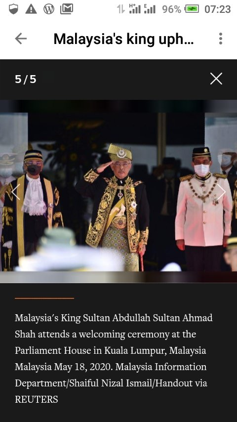 Malaysia’s King Sultan Abdullah Sultan Ahmad Shah receives documents from Prime Minister Muhyiddin Yassin during the welcoming ceremony at the Parliament House in Kuala Lumpur, Malaysia Malaysia May 18, 2020.