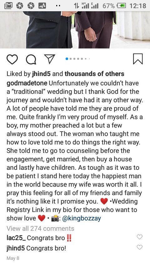 “Unfortunately we couldn’t have a “traditional” wedding but I thank God for the journey and wouldn’t have had it any other way. A lot of people have told me they are proud of me. Quite frankly I’m very proud of myself. As a boy, my mother preached a lot but a few always stood out. The woman who taught me how to love told me to do things the right way. She told me to go to counseling before the engagement, get married, then buy a house and lastly have children. As tough as it was to be patient I stand here today the happiest man in the world because my wife was worth it all. I pray this feeling for all of my friends and family it’s nothing like it I promise you. •“