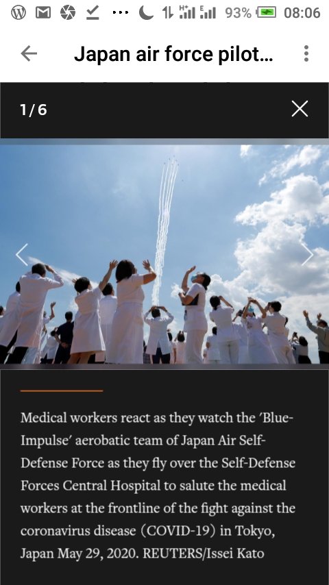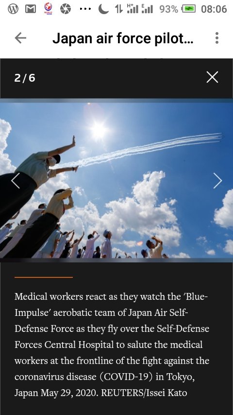 Medical workers react as they watch the ‘Blue-Impulse’ aerobatic team of Japan Air Self-Defense Force as they fly over the Self-Defense Forces Central Hospital to salute the medical workers at the frontline of the fight against the coronavirus disease (COVID-19) in Tokyo, Japan.