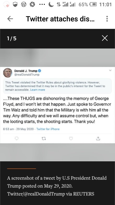 Trump’s message can now be read only after clicking on a notice which says: “This Tweet violated the Twitter Rules about glorifying violence. However, Twitter has determined that it may be in the public’s interest for the Tweet to remain accessible.”