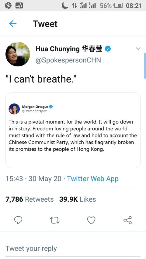 After days of chaotic scenes in the US, on Sunday China’s foreign ministry spokeswoman, Hua Chunying posted “I can’t breathe” – Floyd’s last words – to Twitter, with a screenshot of her American counterpart criticising China’s crackdown on Hong Kong.