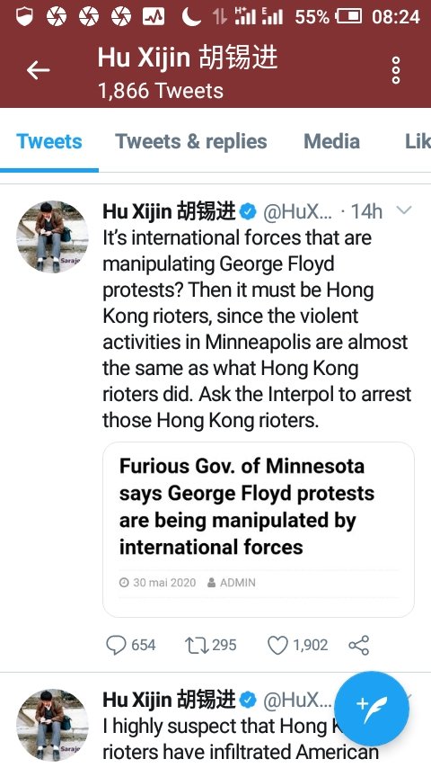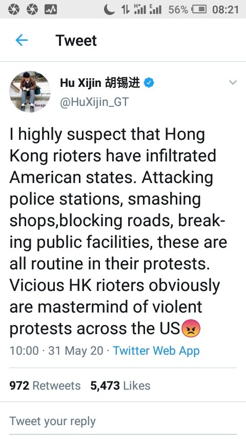 On Sunday, Hu said Hong Kong protesters were “obviously” behind the American demonstrations. “I highly suspect that Hong Kong rioters have infiltrated American states,” he wrote, earning him accusations of peddling conspiracy theories.
