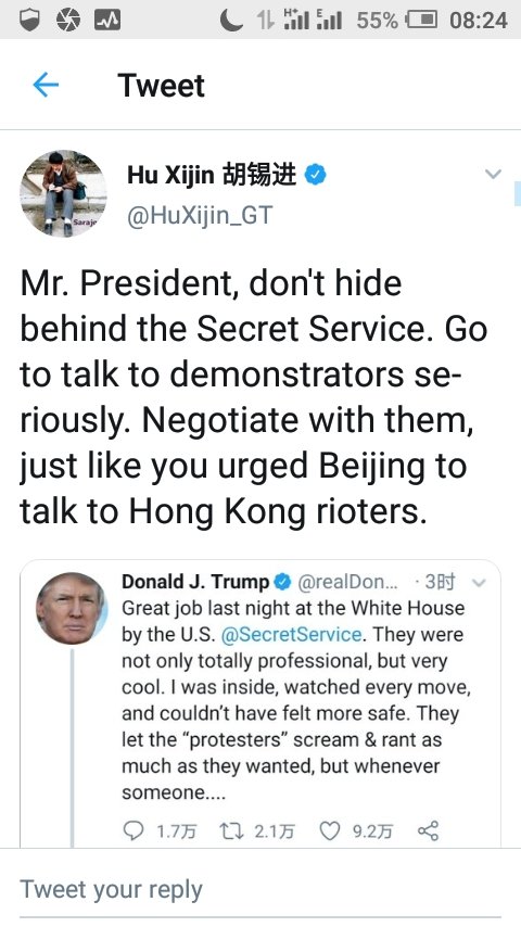 “Mr President, don’t go hide behind the secret service,” said Hu. “Go to talk to the demonstrators seriously. Negotiate with them, just like you urged Beijing to talk to Hong Kong rioters.”