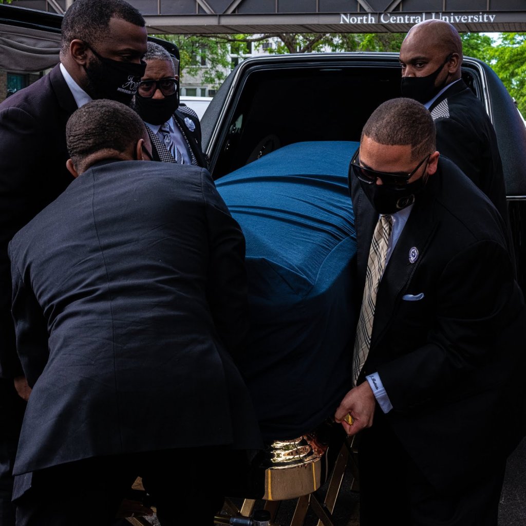 Ahead of the start of Thursday’s official memorial event, Floyd’s body lay in a golden casket surrounded by white flowers. His portrait was to one side, and a brightly lit street mural dominated the back of the auditorium at North Central University, behind the choir and band.