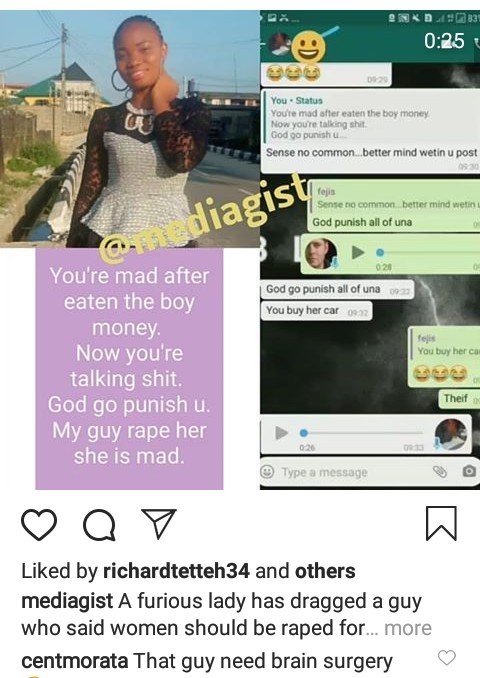 “You’re mad after eating the boy money now you’re talking shit. May God punish you. My guy rape her. She is mad”, the guy wrote.
