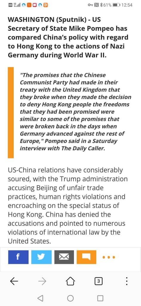 He also mentioned the case of Pompeo who compared China’s policy with regards to Hong Kong to the actions of Nazi Germany during World War II.