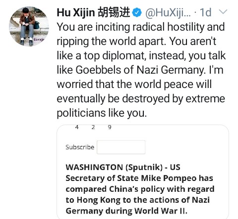 “You Are Inciting Radical Hostility And Ripping The World Apart — Hu Xijin To Pompeo