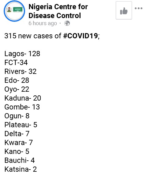9 Jun 20209 Jun 2020 K. Paul Nigeria Records 315 New Cases Of Covid-19 Share this: Share on X (Opens in new window) X Share on Facebook (Opens in new window) Facebook Share on WhatsApp (Opens in new window) WhatsApp More Share on LinkedIn (Opens in new window) LinkedIn Share on Pinterest (Opens in new window) Pinterest Like Loading... Related