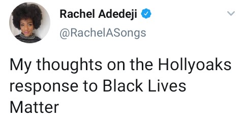 “I am disappointed with Hollyoaks’ approach to showing solidarity with the Black Lives Matter movement yesterday,” she wrote.