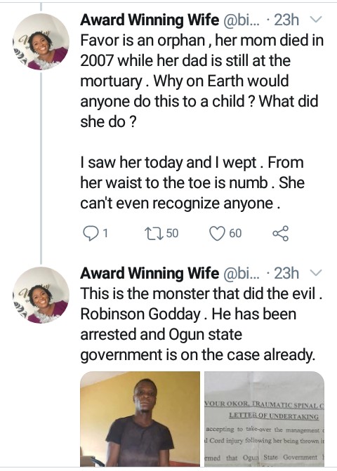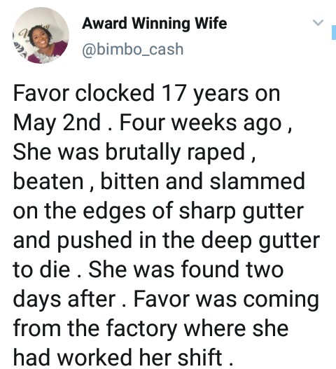 “Favor clocked 17 years on May 2nd . Four weeks ago , She was brutally raped , beaten , bitten and slammed on the edges of sharp gutter and pushed in the deep gutter to die . She was found two days after . Favor was coming from the factory where she had worked her shift .