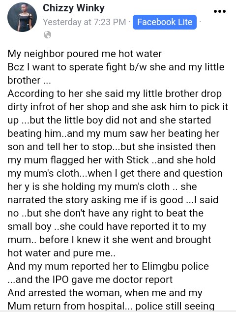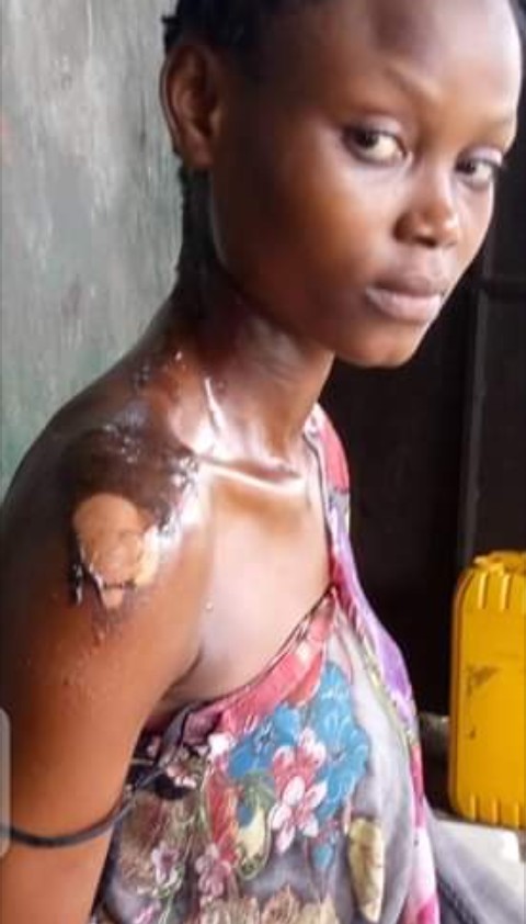 A Nigerian lady identified as Chizzy Winky was scalded with hot water after she tried to separate a fight between her little brother and a neighbour.