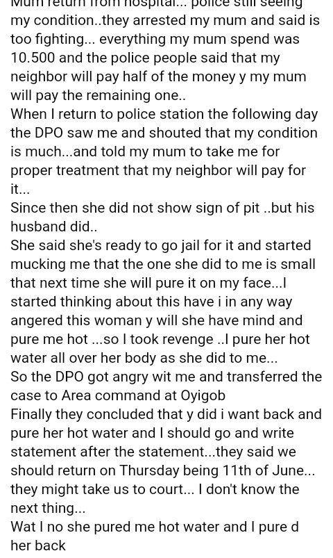 When I return to police station the following day the DPO saw me and shouted that my condition is much…and told my mum to take me for proper treatment that my neighbor will pay for it. Since then she did not show sign of pit ..but his husband did. She said she’s ready to go jail for it and started mucking me that the one she did to me is small that next time she will pure it on my face…I started thinking about this have i in any way angered this woman y will she have mind and pure me hot …so I took revenge ..I pure her hot water all over her body as she did to me…