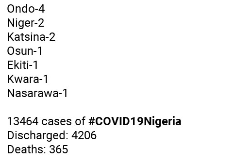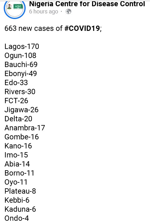 10 Jun 202010 Jun 2020 K. Paul Nigeria Covid-19 Cases Hits 13,464 — 663 New Cases Confirmed Share this: Share on X (Opens in new window) X Share on Facebook (Opens in new window) Facebook Share on WhatsApp (Opens in new window) WhatsApp More Share on LinkedIn (Opens in new window) LinkedIn Share on Pinterest (Opens in new window) Pinterest Like Loading... Related