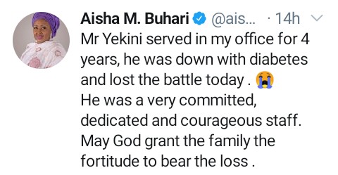 President Muhammadu Buhari’s wife, Aisha, has lost a member of her staff, Sani Yekini.