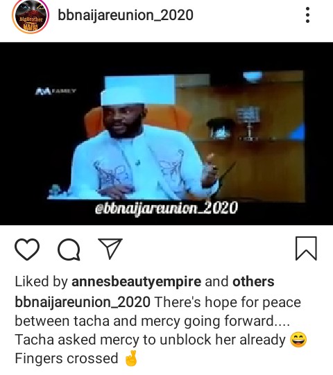 At the end of the show, Tacha pleaded with Mercy to unblock her while Ebuka appreciated them for agreeing to settle their differences off camera.