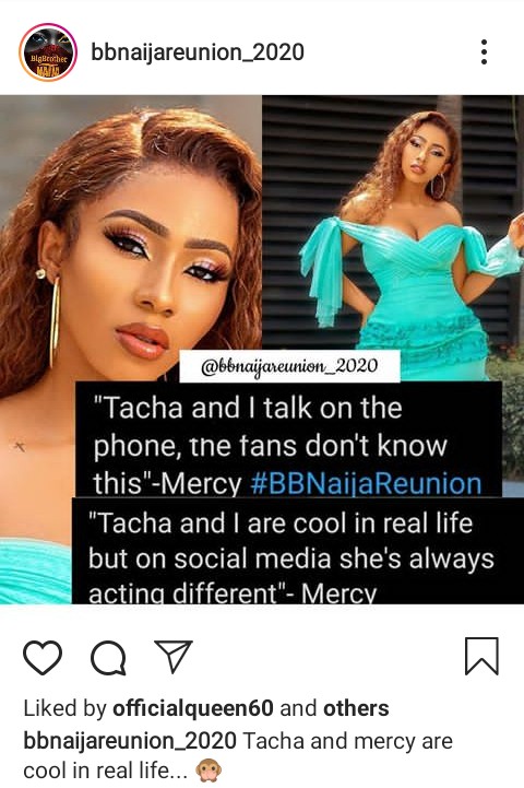 During the Day 11 of BBNaija’s Pepper Dem Reunion, Mercy also made a shocking revelation that she and Tacha are friendly and even talk on phone outside social media.