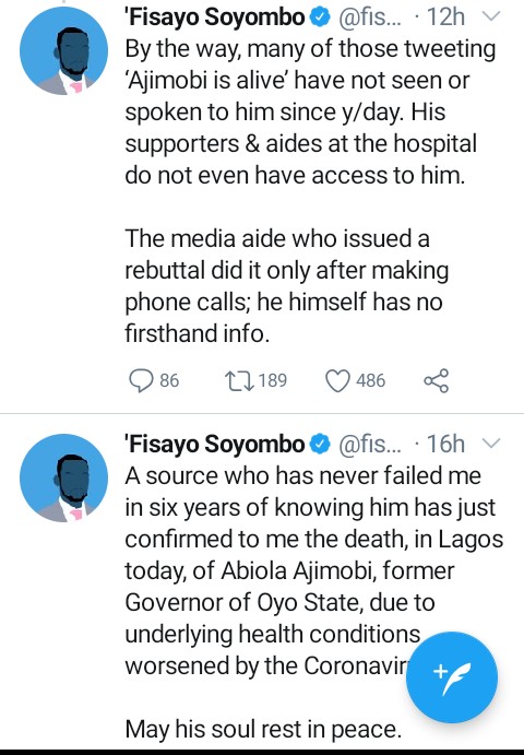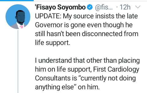 By the way, many of those tweeting ‘Ajimobi is alive’ have not seen or spoken to him since y/day. His supporters & aides at the hospital do not even have access to him.