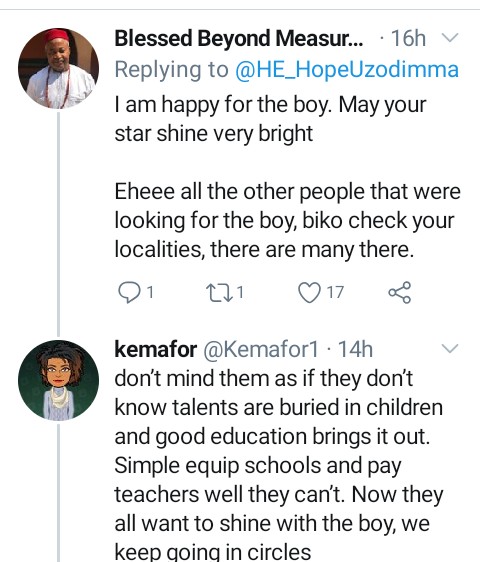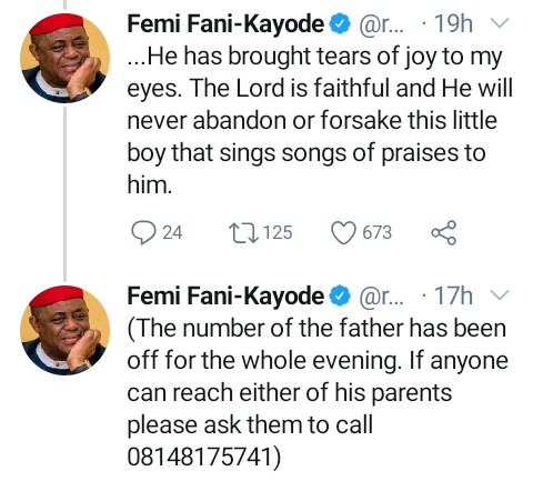 The Imo born singer made waves in the internet during the weekend with a video of his catholic hymn songs which marked him out as a specially talented kid singer. This attracted instant applause and commendations from prominent personalities in the likes of the former aviation Minister, Femi-Fani Kayode and the public.