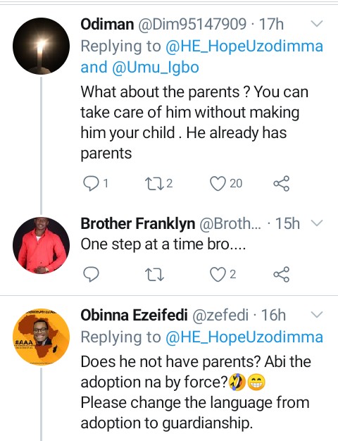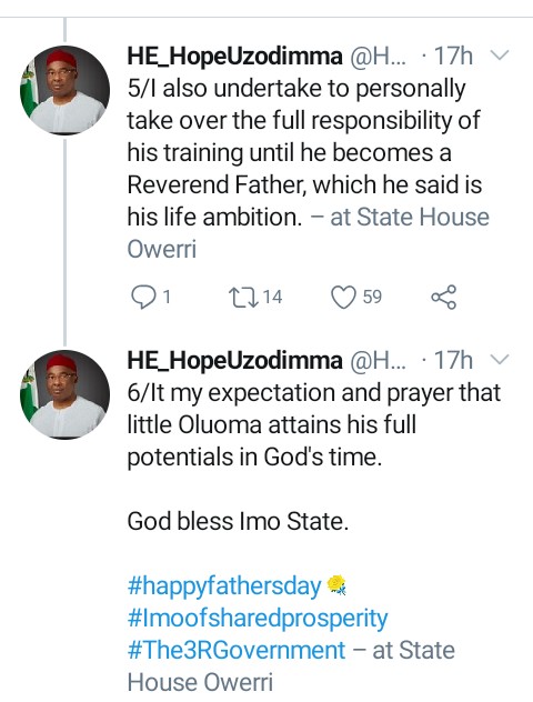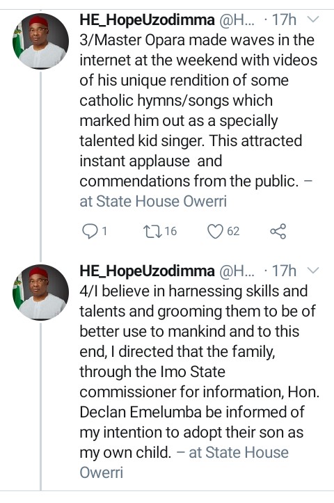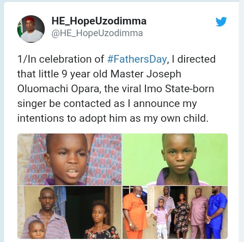 “In celebration of #FathersDay, I directed that little 9 year old Master Joseph Oluomachi Opara, the viral Imo State-born singer be contacted as I announce my intentions to adopt him as my own child.