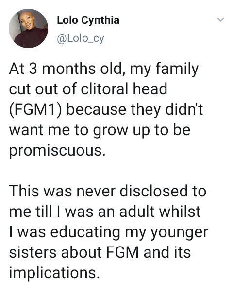 This was never disclosed to me till I was an adult whilst I was educating my younger sisters about FGM and its implications.