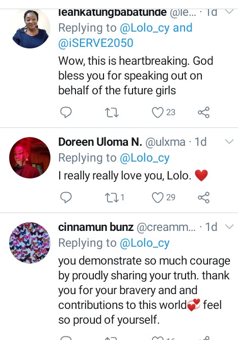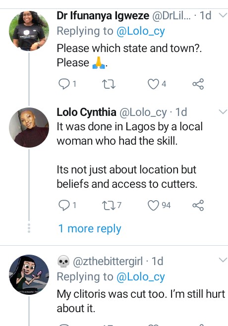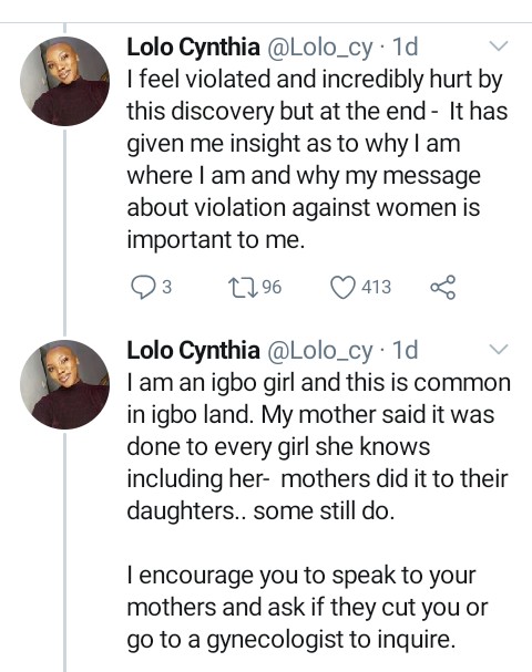Nigerian Activist Lolo Ihesie has revealed she recently discovered she was circumcised as a child and that makes her feel violated and hurt.