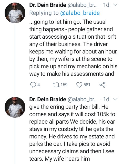 Alabo Braide, the victim whose car was hit by the Uber driver shared details of the incident on Twitter and narrated how his wife stepped in for the Uber driver.