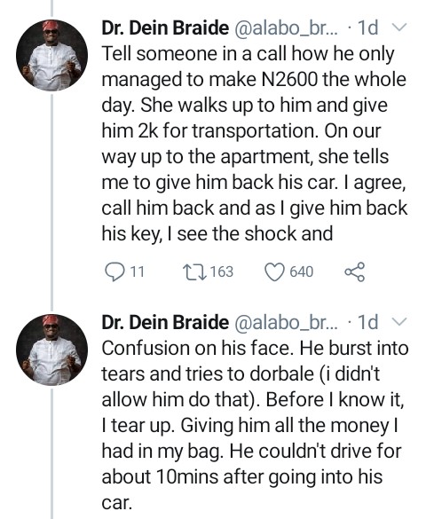 The reaction of the Uber driver towards his little action made him more sober and he was left with no other choice than to gift him some cash to take care of himself.