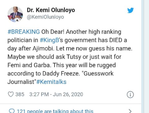 Quote“#BREAKING Oh Dear! Another high ranking politician in #KingB’s government has DIED a day after Ajimobi. Let me now guess his name. Maybe we should ask Tutsy or just wait for Femi and Garba. This year will be rugged according to Daddy Freeze. “Guesswork Journalist #Kemitalks” she wrote.