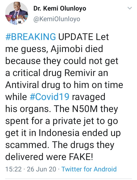 It is not clear if the personality died of COVID-19 but recall that a few months back, Kemi Olunloyo broke the news that late Chief of staff to the president, Abba Kyari died of coronavirus.