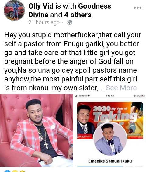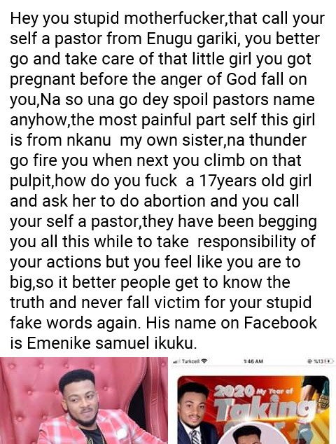 “Hey you stupid motherfvck£r,that call your self a pastor from Enugu gariki, you better go and take care of that little girl you got pregnant before the anger of God fall on you,Na so una go dey spoil pastors name anyhow,the most painful part self this girl is from nkanu my own sister,na thunder go fire you when next you climb on that pulpit,how do you fv.¢.k a 17years old girl and ask her to do abortion and you call your self a pastor,they have been begging you all this while to take responsibility of your actions but you feel like you are to big,so it better people get to know the truth and never fall victim for your stupid fake words again. His name on Facebook is Emenike Samuel Ikuku.”