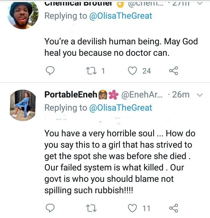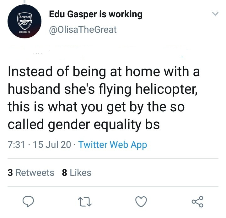 Reacting to her death, @Olisathegreat wrote: “Instead of being at home with a husband she’s flying helicopter, this is what you get by the so called gender equality bs.”
