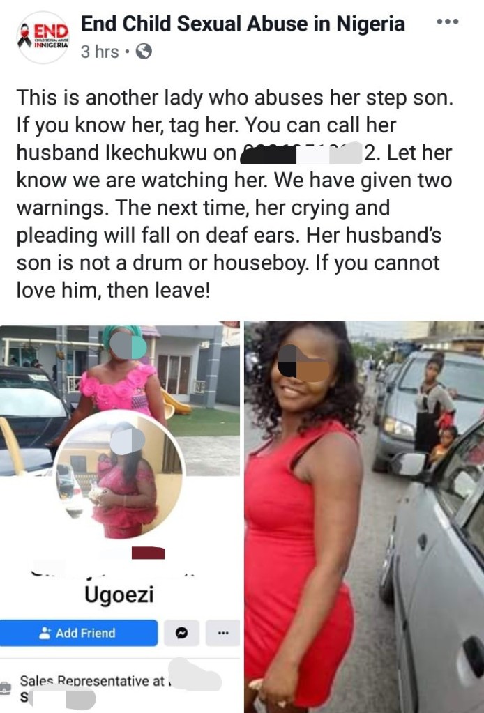 The group, End Child Sexual Abuse in Nigeria, shared photos of the woman and warned her that the next time she abuses her stepson as she allegedly does, they will not listen to her pleas, neither will they consider her tears.