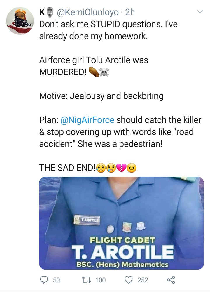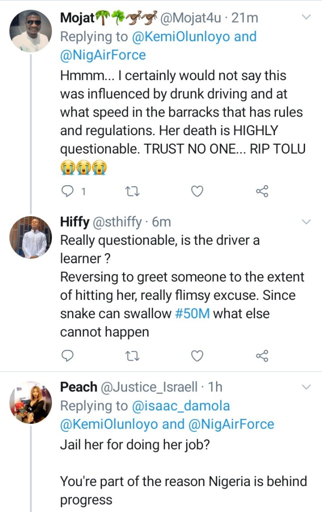 “Plan: @NigAirforce should catch the killer and stop covering up with words like road accident. She was a pedestrian!