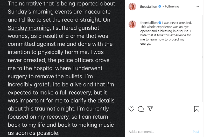 However, according to Megan’s statement, she actually ‘suffered gunshot wounds’ as a result of the crime, which she claims was committed against her. She also said she underwent surgery at the hospital to remove the bullets.