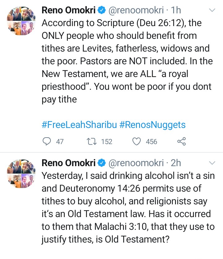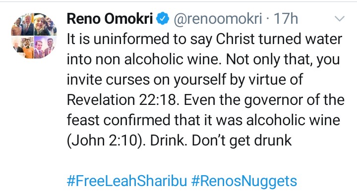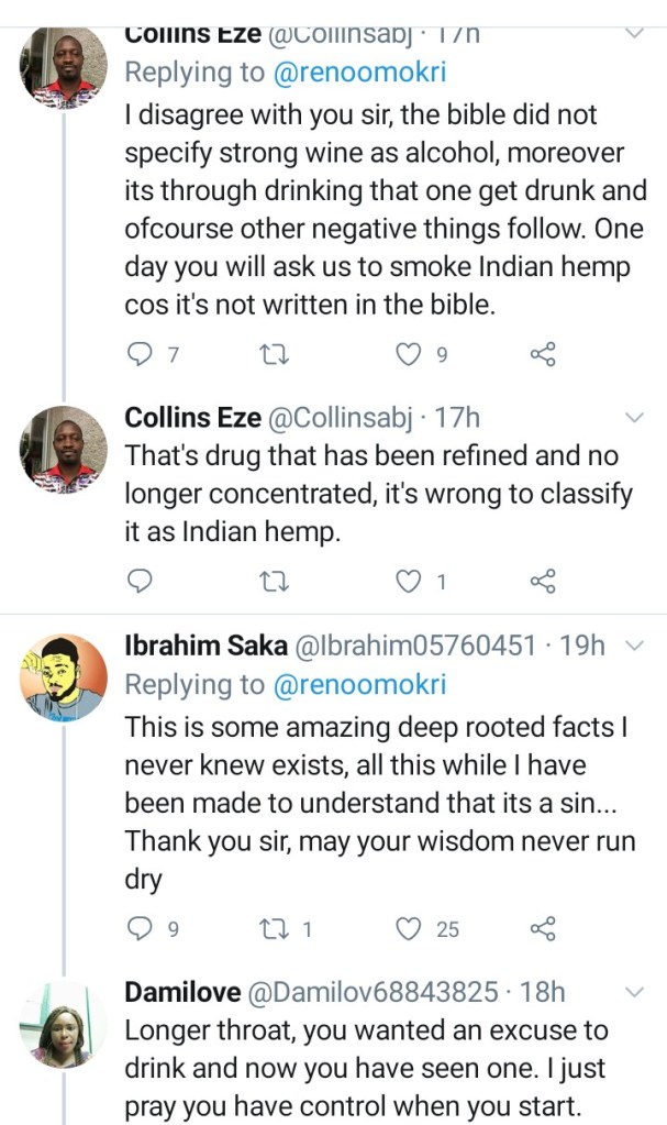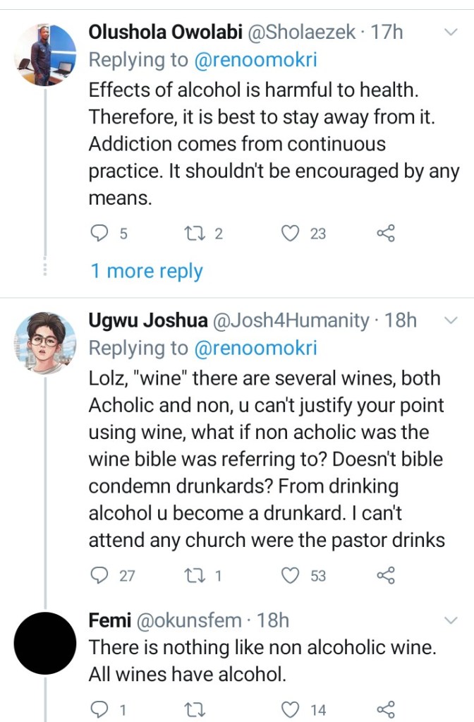 Author and lawyer, Reno Omokri has sparked another debate on Twitter after saying the consumption of alcohol is not a sin for Christians.