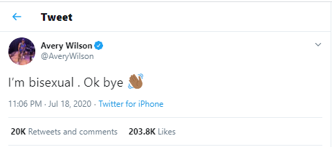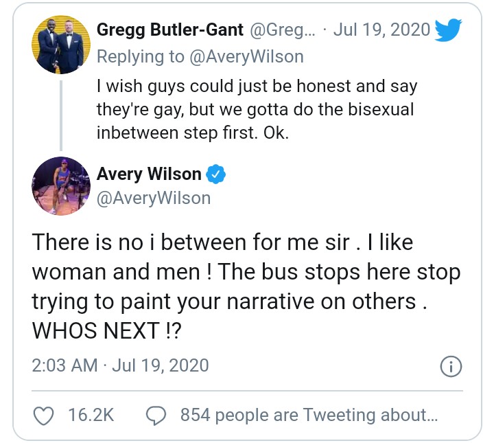 Avery Wilson clapped back: “There is no in between for me sir. I like woman and men! The bus stops here, stop trying to paint your narrative on others. WHO’S NEXT!?”