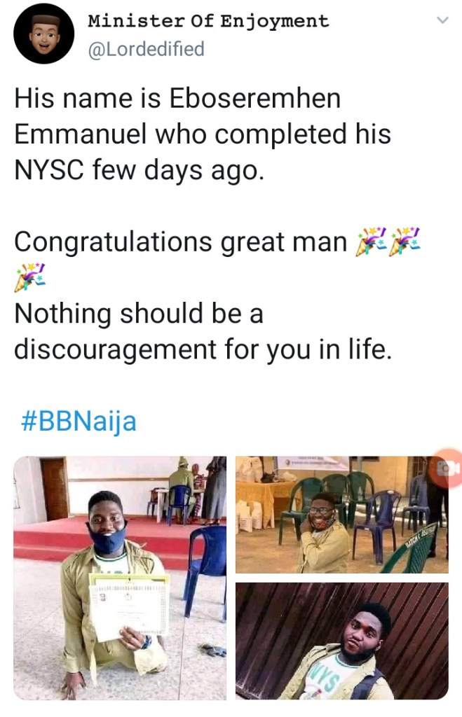 Eboserehen Emmanuel is a political scientist who just completed his NYSC few days ago.
