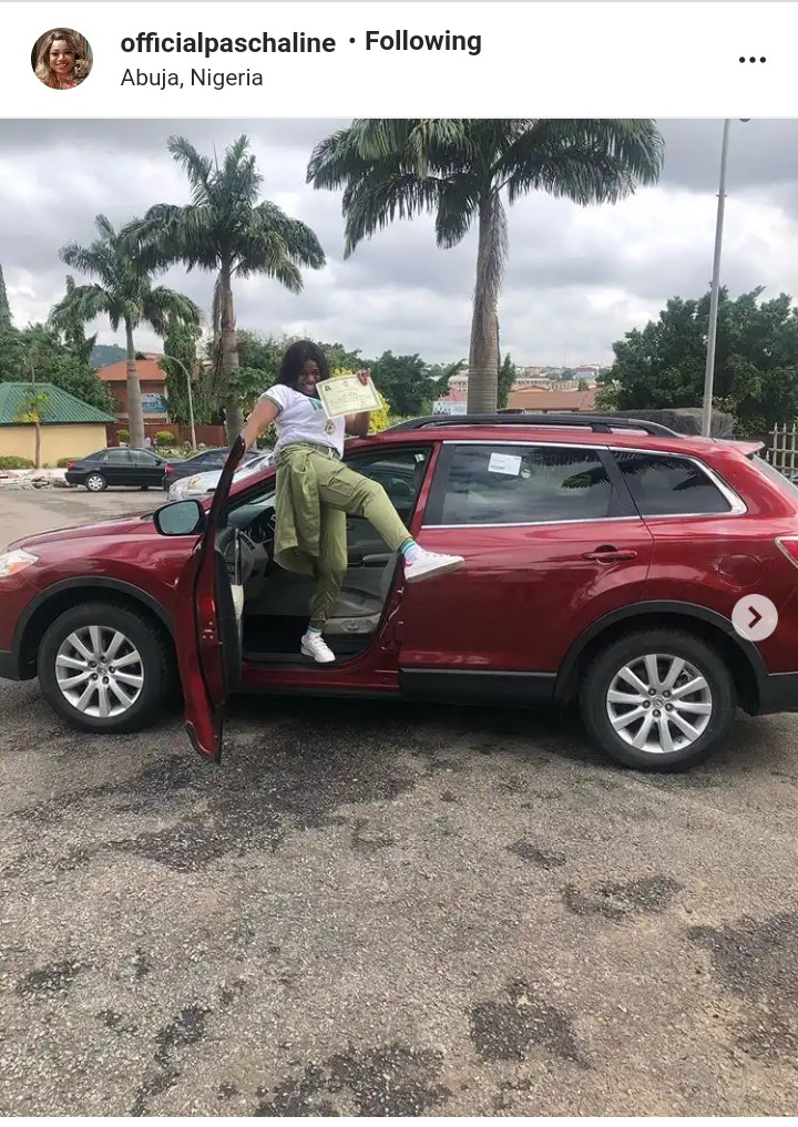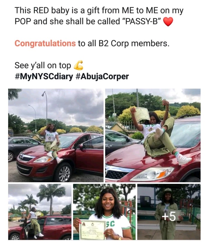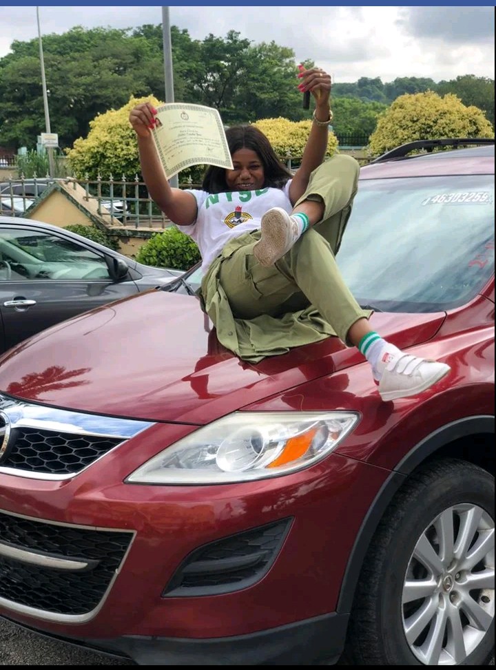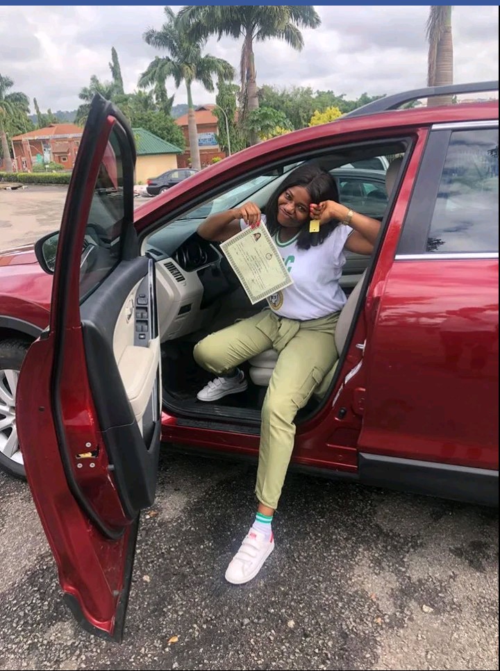 Sharing photos of her new car and her NYSC discharge certificate, Paschaline Bernard Ifeoma said;