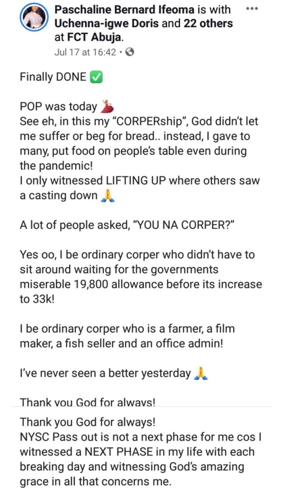 She added that passing out from NYSC is not a “next phase” for her because she has already witnessed her next phase.