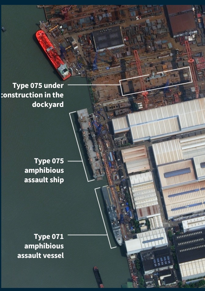 This Reuters annotation of a Maxar Technologies satellite image from April 1, 2020, shows three of China’s amphibious assault vessels at a Shanghai shipyard.