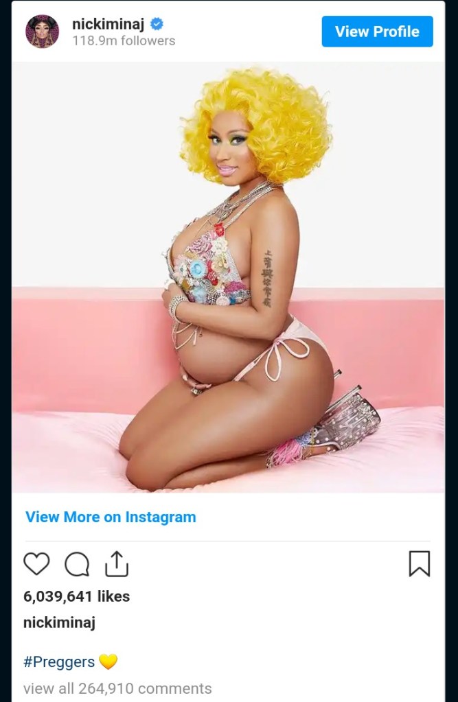 Minaj simply captioned the photo “#Preggers”, followed by a yellow heart.