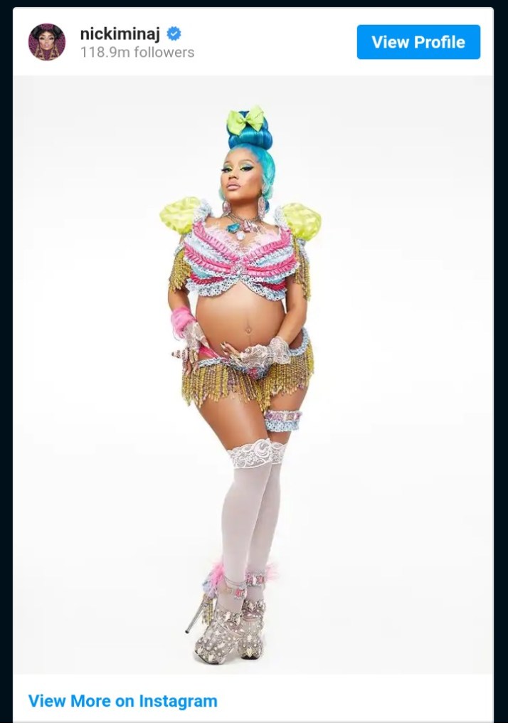 On Monday (Jul 20) The “Anaconda” rapstress took to Instagram and uploaded an adorable photo of herself pictured in a baby themed bralet, with her pregnant baby bump on show.