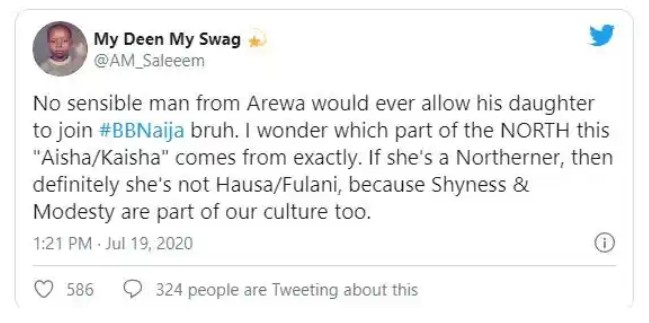“No sensible man from Arewa would ever allow his daughter to join #BBNaija. I wonder which part of the NORTH this “Aisha/Kaisha” comes from exactly. If she’s a Northerner, then definitely she’s not Hausa/Fulani, because shyness and modesty are part of our culture too.”