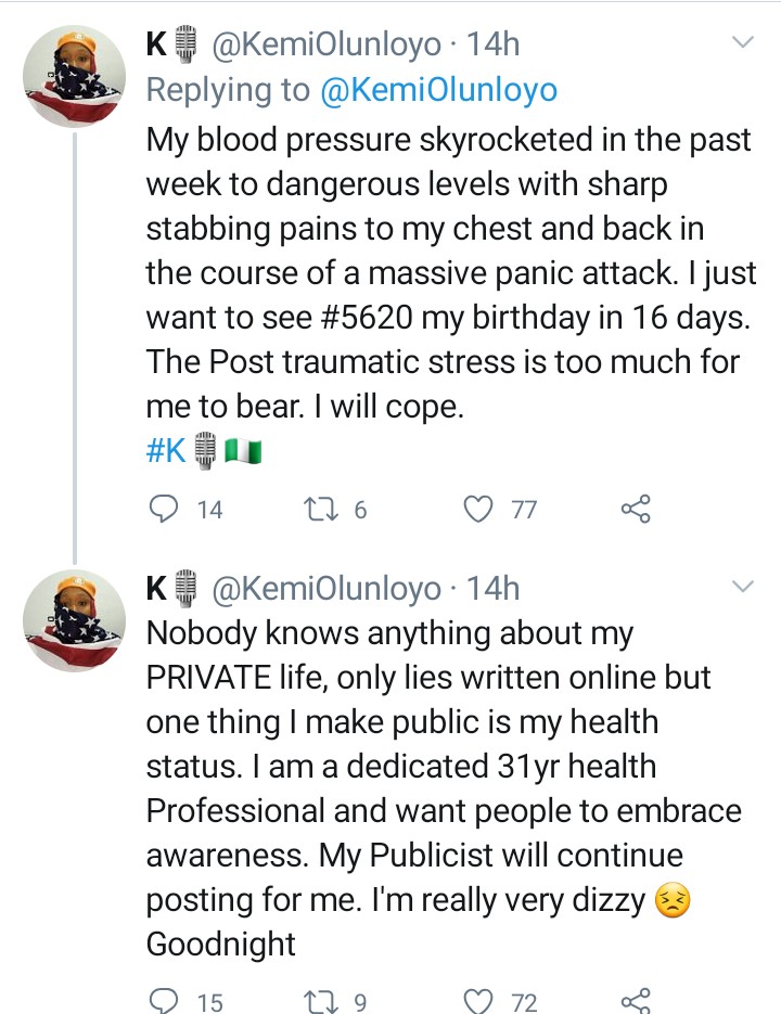 In a follow-up post she made on twitter, the journalist claimed that her health has significantlydeteriorated.