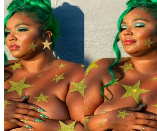 American singer, Lizzo, whose real name is Melissa Viviane Jefferson, shared these new photos of herself posing topless with her hands covering her nipples.
