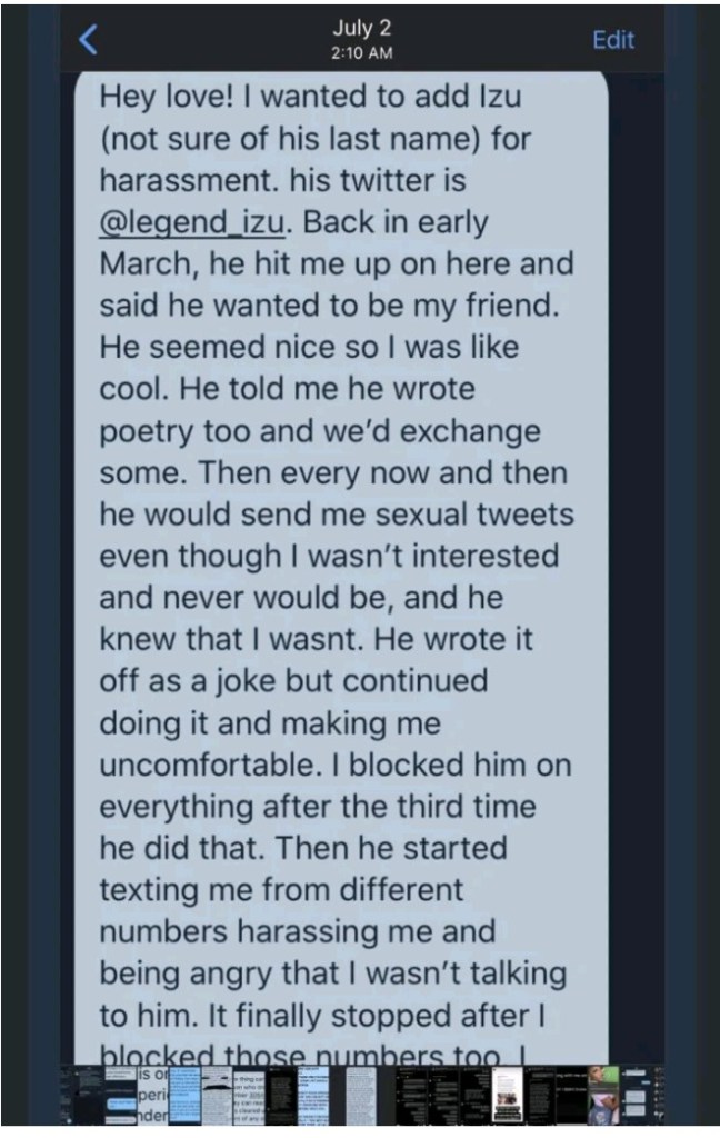 A Twitter influencer named Nanichi Anese, had on June 29, 2020, accused the 23-year-old creative designer of harassment – not rape as widely claimed by friends who were angered by Izu’s demise.