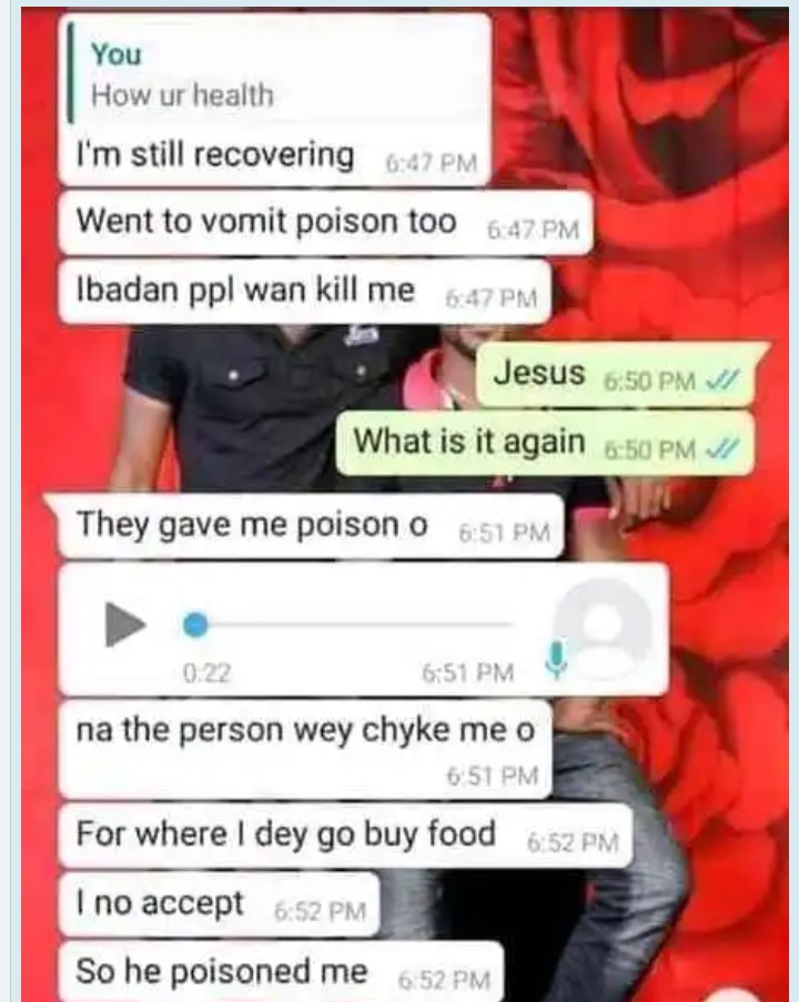 A leaked chat between she and her friend while she was sick says that she was poisoned by a man she SAID NO to in Ibadan where was observing her mandatory one year NYSC program.